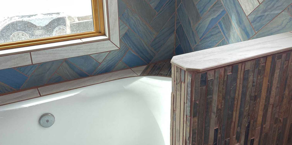 Custom soaking tub and shower surround for a client that loves the mountains of Taos. A herringbone pattern with different colors and sheens of tiles were used to mimic the mountains. Using the colors found in the landscape, this inspiring bath was created for relaxation!